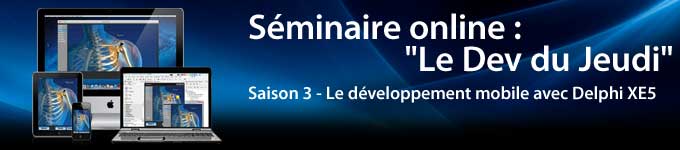 Tout savoir sur le développement mobile avec Delphi XE5 Venez participer à cet évènement online récurent entièrement en Français pour tout découvrir sur le développement mobile sur Android et iOS avec Delphi XE5. 12 épisodes, avec à chaque épisode, un développement d'une application mobile 1 épisode chaque jeudi, avec à chaque fois le développement d'une application mobile complète pour tablettes et téléphones Android et iOS. 12 épisodes au total pour savoir comment créer des applications avec le même code source pour les plateformes Android et iOS, en s'adaptant aux différents types de périphériques tablettes ou téléphones. Agenda: