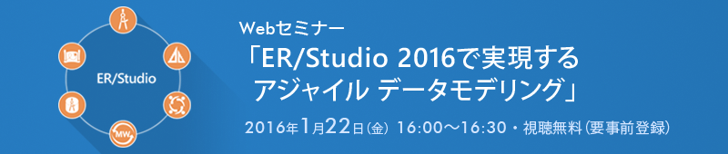 Webセミナー「ER/Studio 2016で実現するアジャイル データモデリング」ER/Studio待望の新バージョン「2016」がリリースされました。ER/Studio 2016では、ビッグデータ、クラウドデータベースのサポートなどを強化し、複雑化/多様化する企業のシステム系におけるデータの一貫性の維持を可能にするコラボレーションモデリング環境を強化しています。データモデラーは、頻繁に変化する開発プロジェクトでのデータモデルに対する要求にすばやく対応可能に!アジャイル データモデリングを効率よく実践できます。 今回、新バージョンリリースに合わせて、ER/Studio 2016の新機能とその活用方法を紹介するWebセミナーを開催。先進のモデリング環境の情報を、オンデマンドで配信します。 開催概要Webセミナー「ER/Studio 2016で実現するアジャイル データモデリング」